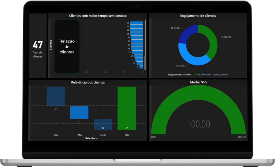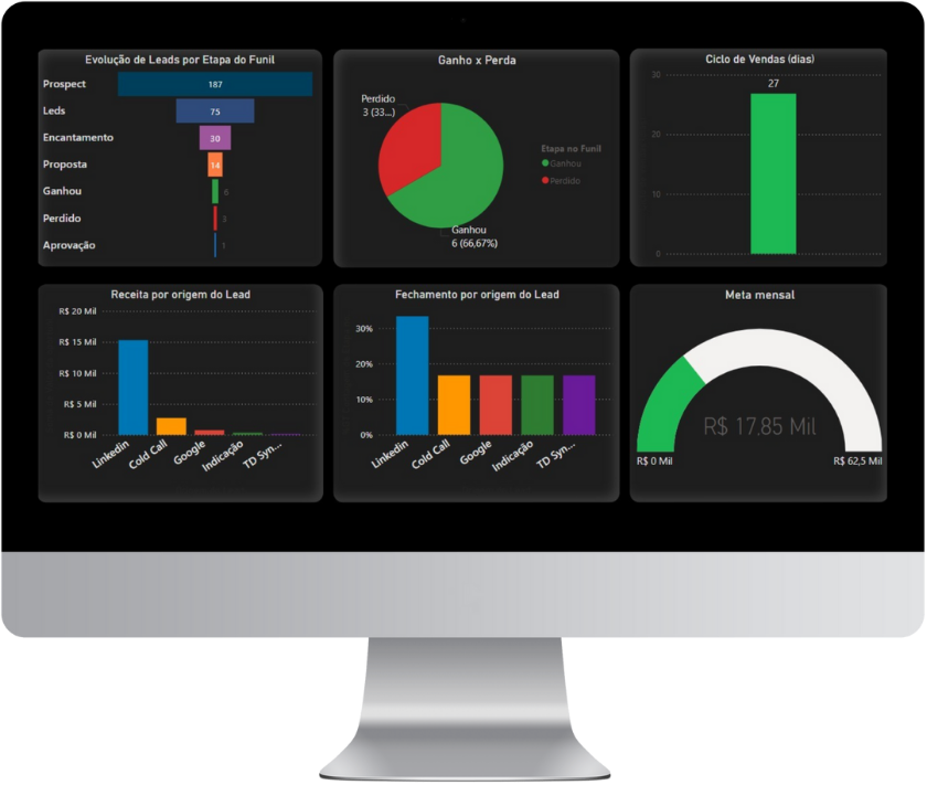 Visualize funis, metas e KPIs em tempo real.
